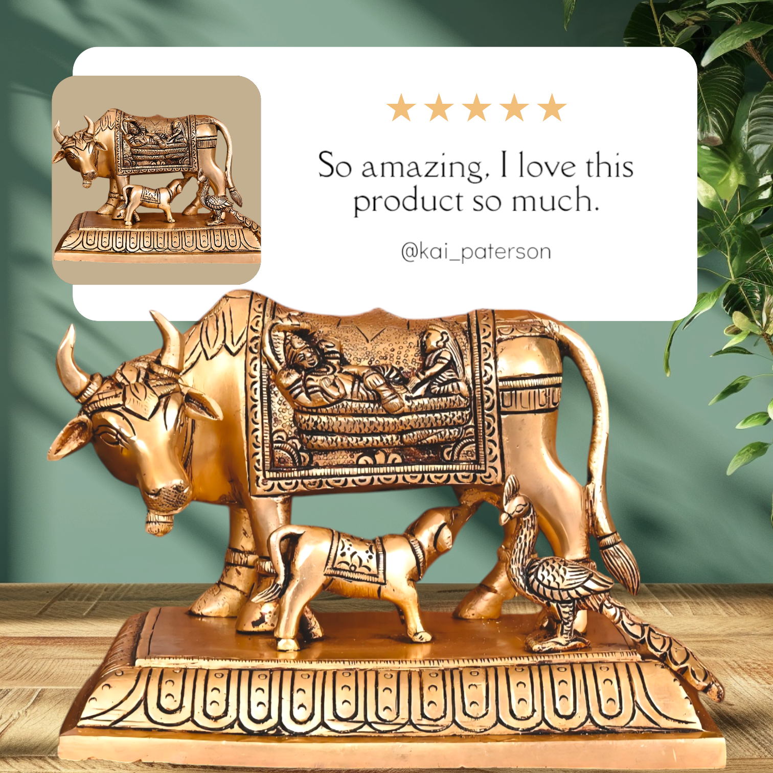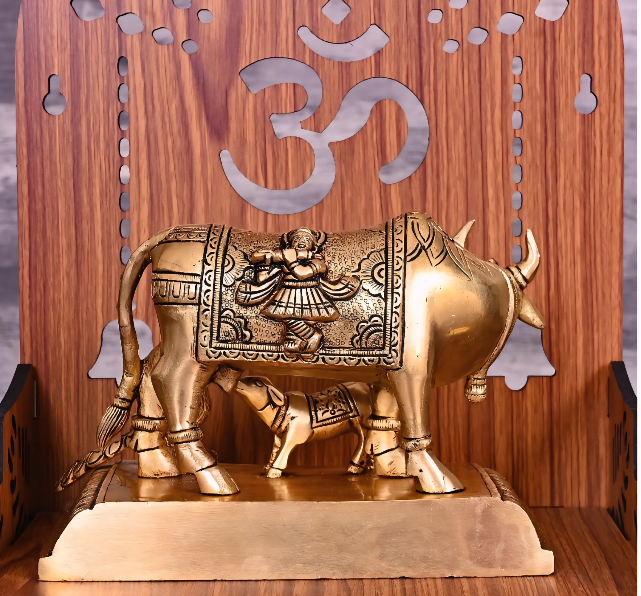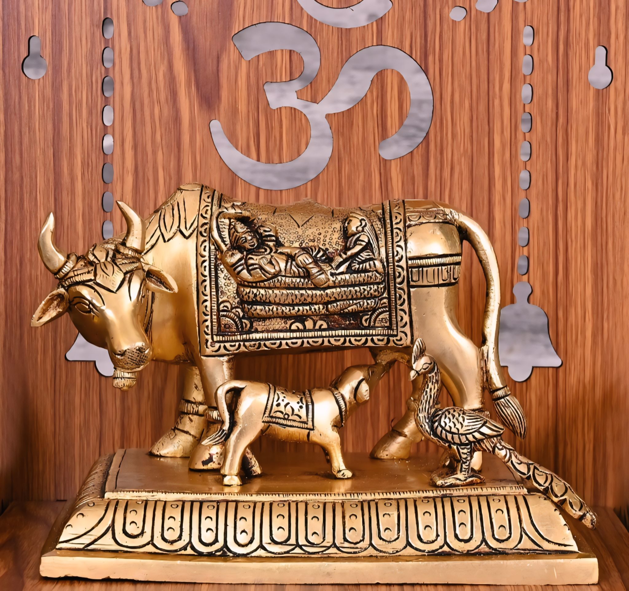 The beautiful creation of the kamdhenu cow & calf is a perfect symbol of the undying aura of the holy saint that encompasses numerous devotees around the globe. This statue aptly conveys the emotions of people who consider the cow (gomata) as a motherly figure. Kamdhenu cow & calf statues are widely used for decoration purposes in homes and offices. It serves as a great gift, especially around religious celebrations and festivities. This brass handicraft has been made by skilled artisans from the Shivani Handicrafts Giftorium